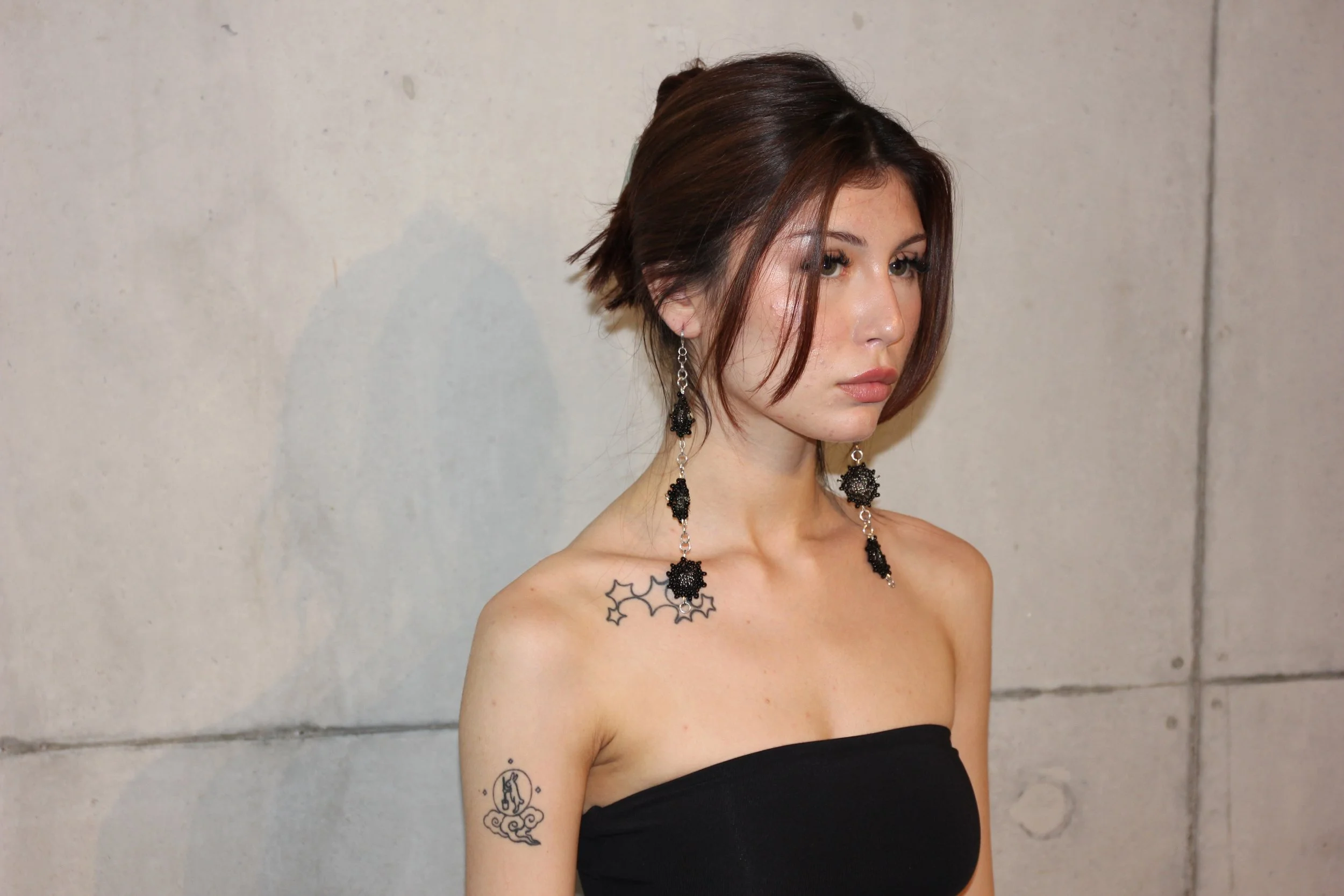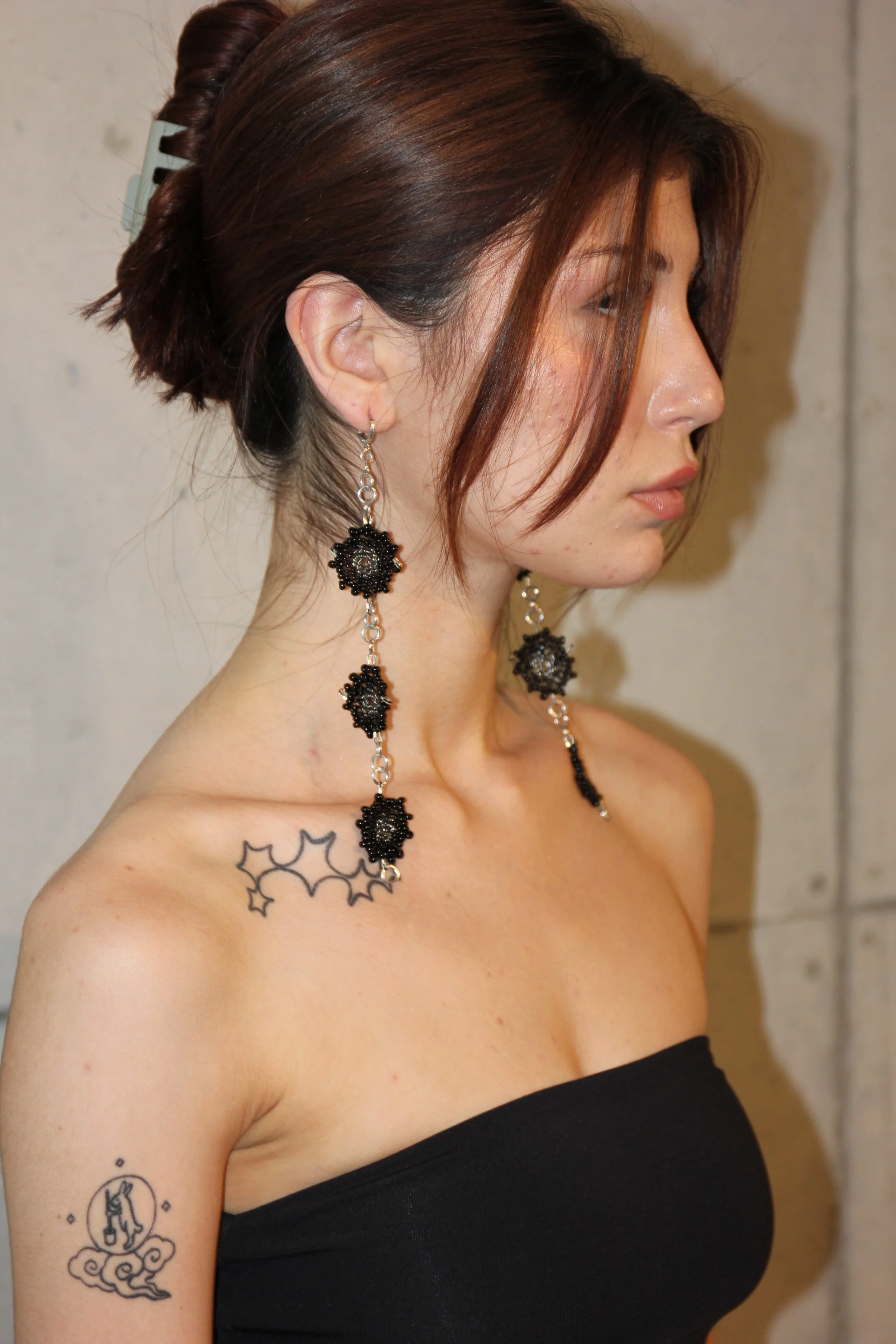 These earrings were featured in the ELLEANNA-S/S-2024 runway, paired with The Sensa dress. They are a 1 of 1 piece, made from handmade chainmail with aluminum jump rings and peyote-stitch beading using shades of black glass beads. These are a more elevated design than our Eternal Earrings and perfect for spicing up any outfit.